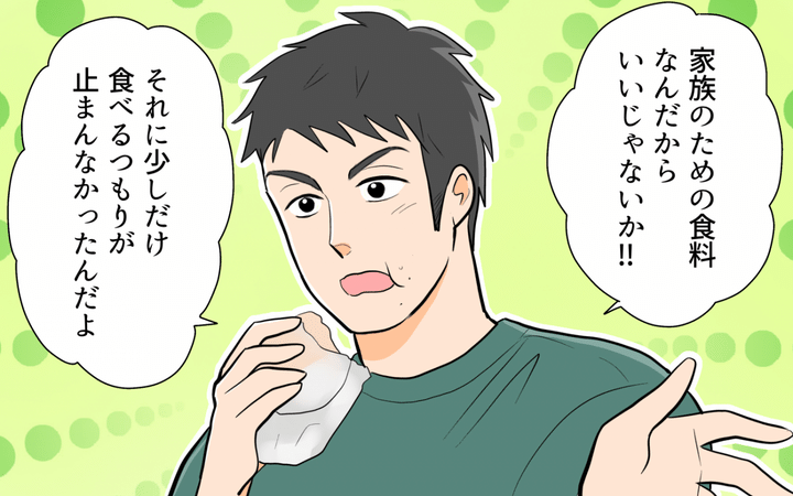 私が子どもの寝かしつけをしている間に、数日分の食料を食べ散らかし、「家族のための食料なんだから」「自分の家でくらい好きなだけ食べたい」と夫は言います。