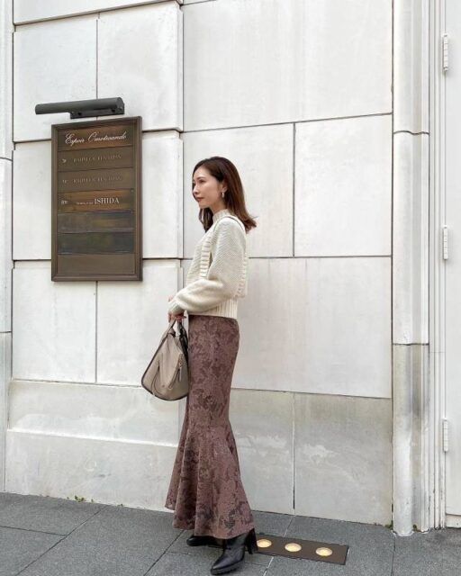 というのもショートブーツは履き口が見えがち。長め丈スカートを合わせれば履き口がさりげなく隠れるため、コーデバランスがよくなります。加えてヒールがあるおかげで腰の位置が高く見え、スラリとした着こなしに。
