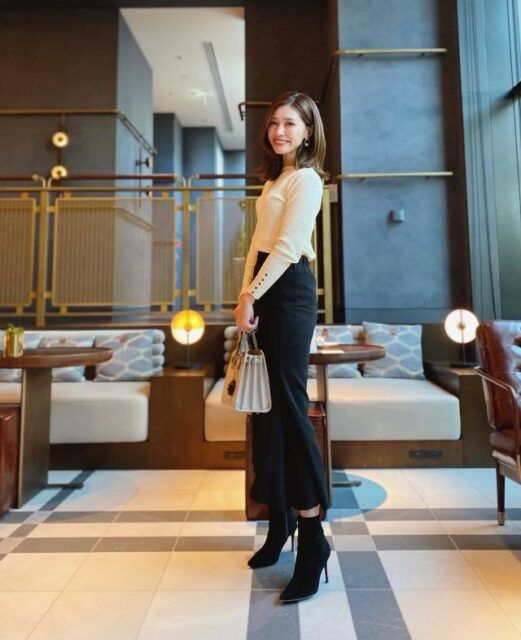 ピンヒールのロングブーツに合わせるボトムは「短め丈」が最適。脚長効果のあるブーツと短いパンツ&スカートの合わせ技でスタイルアップ見えすること間違いなしです。このとき筒が太いブーツであればショートパンツを合わせてモードに、筒が細めならミニスカートと合わせて韓国風にコーデするのがおすすめ。