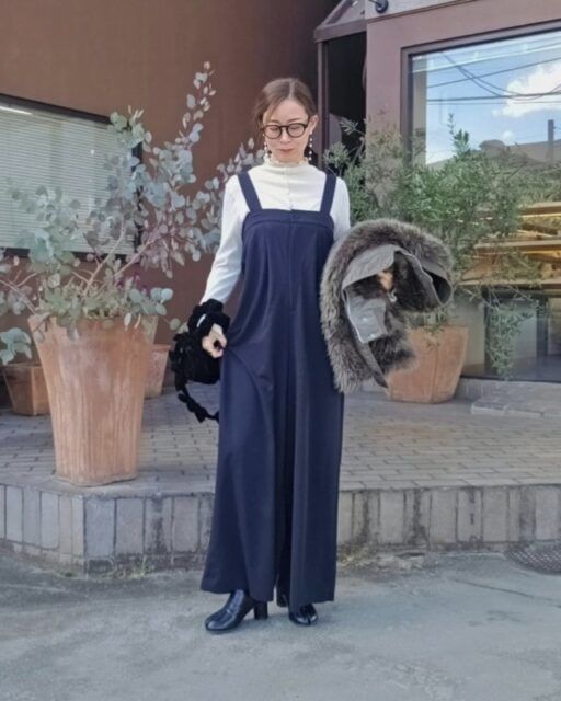 ヒールが太いチャンキーヒールブーツにパンツを合わせるときは「ワイドパンツ」が最適。ゆったりしたパンツがブーツの筒まわりを覆い、ヒールのおかげでさりげなく底上げできます。ワイドシルエットならサロペットパンツも似合いますよ。