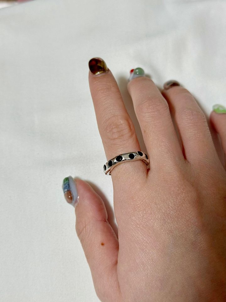 色々試着していると、今着けているジュエリーとのレイヤリングにもぴったりなじむ黒のガラスが並ぶナローリングに出合い、即決。価格も日本円でおおよそ1万円台前後〜と手頃なのも魅力です。