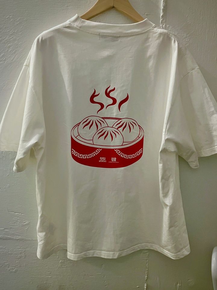 購入したのは白地に赤のグラフィックがいかにもなTシャツ。背中にはせいろで蒸したほかほかの豚まんのイラストがドーンと鎮座し、そこから立ち昇る湯気は、よく見ると551! そして表側の胸もとには、関西では知らない人がいない蓬莱のCMの名フレーズ“ARUTOKI(あるとき~)”が。