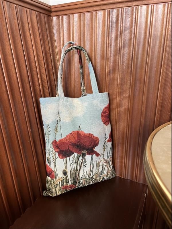 今回ひとめぼれしたのは、ふらっと立ち寄ったセレクトショップの壁に掛かっていた、かれんなポピーが描かれた1点。風にふわりと揺れるようなポピーのデザインと、少しコンパクトなサイズ感、そしてジャガード織の素材感。全てが今の気分にぴったりなで、迷うことなく即決でした。