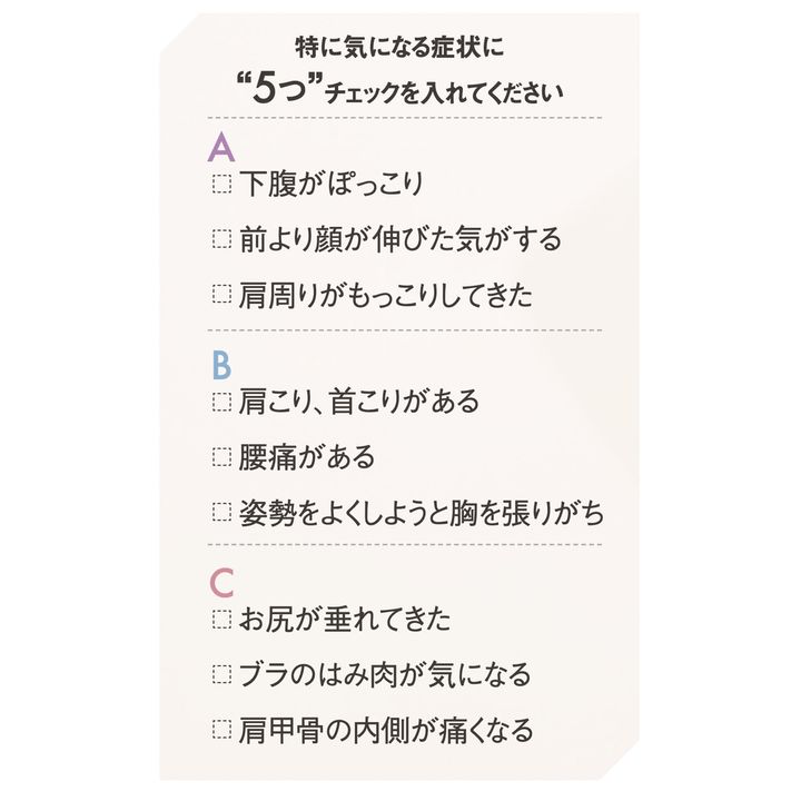 ゆるみパーツ診断チェックリストであなたのタイプが判明!特に気になる症状に5つチェックを入れるだけで、強化すべきパーツがわかります。