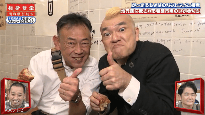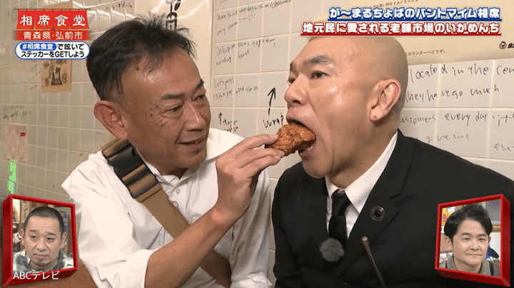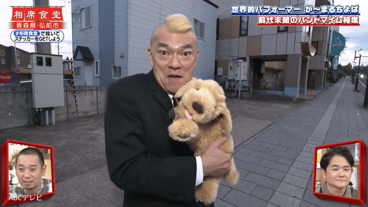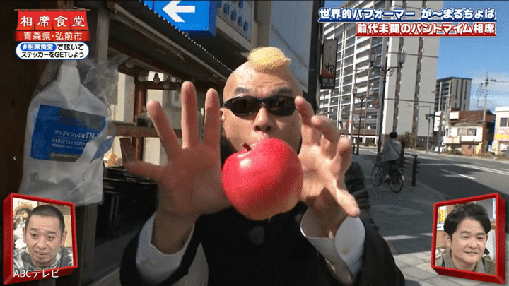 得意のパントマイムで⾃⼰紹介したが〜まるちょばは、青森県弘前市で「⼀切話さずにパントマイムだけで(ロケを)成立させてみせます!!」とサイレントで宣言。犬の散歩やエスカレーターの昇降、りんごの空中浮遊といった定番ネタを披露しながら、地元民に愛されている市場になんとかたどり着き、優しい中年男性との相席に成功した。