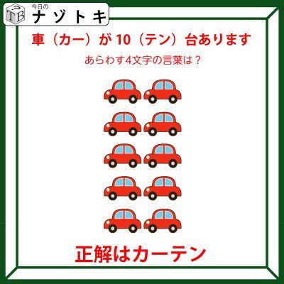 このイラストは車です。車は英語で「カー」といいますね。また、その数は「10台」つまり、「テン」ですね。ということは「カード」が「テン」あるということです。ここまでいけばわかりますね。正解は「カーテン(カーがテン)」でした。