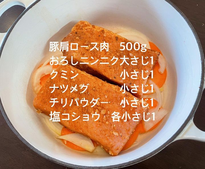 2. 豚肩ロース肉におろしニンニクをすりこみ、その後混ぜ合わせクミン、ナツメグ、チリパウダー、塩、胡椒もすり込む。