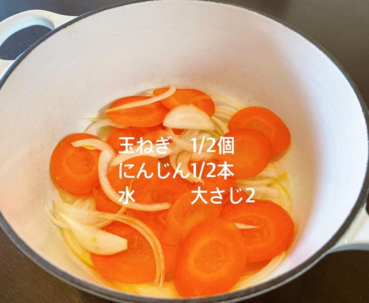 3. ホーロー鍋(ル・クルーゼやSTAUBなど)に野菜を敷き、水大さじ2を加え、肉をのせる。