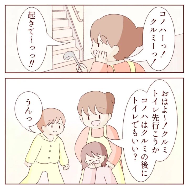あっという間に子ども達を起こす時間です。「コノハーっ!クルミーっ!起きて~っっ!!」子ども達が2階から降りてきたら「おはよ~!クルミ、トイレ先行こうか。コノハはクルミの後にトイレでもいい?」と声をかけながら順番にトイレに連れて行きます。