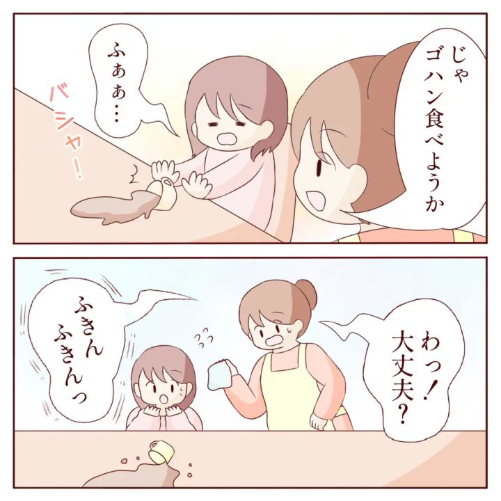 先に席についたクルミにお茶を出し「じゃ、ゴハン食べようか」と朝食を出そうとしていたら、あくびをしながらコップに手を伸ばしたクルミがお茶をこぼしてしまいました。「わっ!大丈夫?ふきん、ふきんっ」思わぬハプニングで今日はいつもより朝食に時間がかかってしまいました。