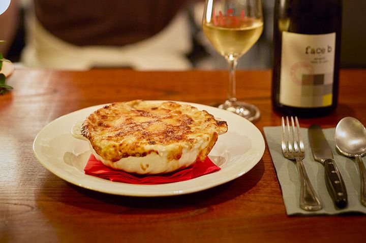 何だろう、この吸引力は。東急目黒線・西小山駅から徒歩4分。駅からレトロな商店街を抜けていくアプローチといい、アーチ状天井のおこもり感ある空間といい。そして、これだ。酒場の臨場感を引き上げる手書きメニューの黒板にも、抗いがたい魔力が潜んでいる。並ぶつまみはわずか10品余り。初めて訪れたときはこれだけ?と拍子抜けしたが、それも一瞬のこと。パテ、グラタンときて、カルパッチョや自家製の平打ちパスタも。しかもワインバーには珍しく、牡蠣やマハタにアオリイカといった魚の名が点在。聞けば、オーナーシェフの仲西正和さんは、和食割烹を皮切りに、イタリアンや、名ビストロ『uguisu』でも腕を磨いてきた。黒板に並ぶのは、和、伊、仏の技を集約したつまみたちだ。紹介する「牡蠣と原木椎茸のグラタン」は、ベシャメルソースが口溶けよく実になめらか。ミルキーで上品なコクがあり、潮の香りと複雑にからみ合う。