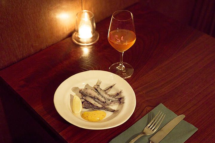 何だろう、この吸引力は。東急目黒線・西小山駅から徒歩4分。駅からレトロな商店街を抜けていくアプローチといい、アーチ状天井のおこもり感ある空間といい。そして、これだ。酒場の臨場感を引き上げる手書きメニューの黒板にも、抗いがたい魔力が潜んでいる。並ぶつまみはわずか10品余り。初めて訪れたときはこれだけ? と拍子抜けしたが、それも一瞬のこと。パテ、グラタンときて、カルパッチョや自家製の平打ちパスタも。しかもワインバーには珍しく、牡蠣やマハタにアオリイカといった魚の名が点在。聞けば、オーナーシェフの仲西正和さんは、和食割烹を皮切りに、イタリアンや、名ビストロ『uguisu』でも腕を磨いてきた。黒板に並ぶのは、和、伊、仏の技を集約したつまみたちだ。紹介する「メヒカリの唐揚げは、はっと驚くほどに完璧な火入れ。繊細な身がほろりとほどけ、にんにく風味の自家製ピリ辛マヨネーズソースと溶け合い、思わず後をひく。キンと冷やした白ワインを用意して、ぜひつくっていただきたい。