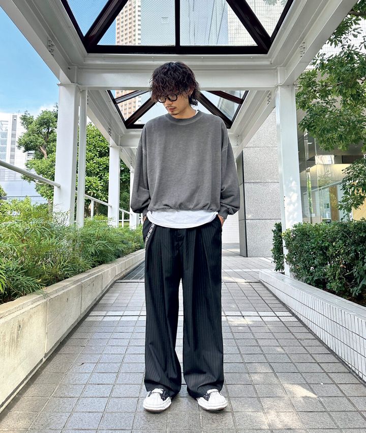 ヴィンテージ感ある低温染め加工のスウェットをトップスにオン。ほどよいルーズシルエットに、裾から白Tをレイヤードすることで抜け感をプラスしています。足元はボリュームスニーカーでバランスよくコーデ。