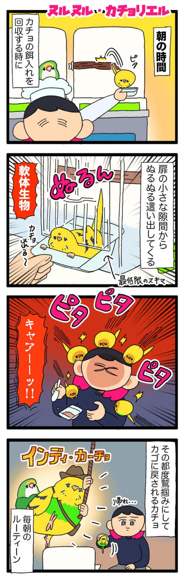 絵を描く仕事をしながら、鳥専門のペットショップで働いてるえるぽぴさん。インコへの愛情あふれるエピソードを絵日記で配信しています。ここでは、「我が家のインコたちのはなし」から『大天使カチョリエル』のエピソードを第1話から順にご紹介します。