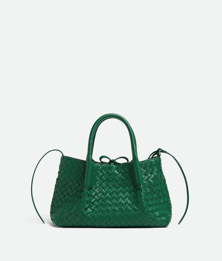 イベントの先行アイテムとして、グリーンカラー“ジャングル”の“ピナコテーカ”バッグが登場。機能的でベーシックな構造に独自のデザインが映え、洗練されたユニークさを放つ逸品だ。10㎜幅のイントレチャートがより繊細でフェミニンな表情を引き出し、アイコンバッグ“カバ”のシグネチャーを受け継いだハンドルは、取り付け部分のイントレチャートに寄せたシワまで計算し尽くして成形されている。外側に垂らして個性を添えたり、バッグのシルエットを変えたり、しっかり閉じるためにも使えるレザーバンドがアクセント。