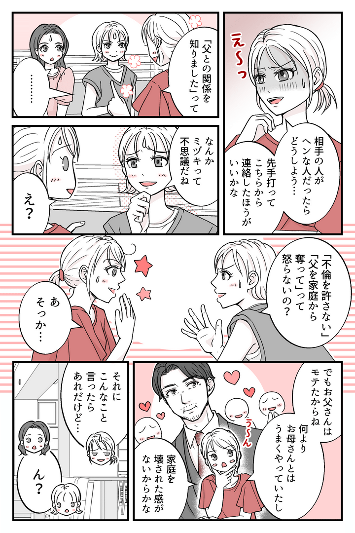 リサとモエに相談し「母には父の不倫を知らせない」「何かあったときのためにメールを捨てない」と決められてよかったです。しかしその後も父の不倫の件が頭から離れません。自分でも嫌になるくらい気になって、必要以上に母や姉の様子を伺うようになりました。