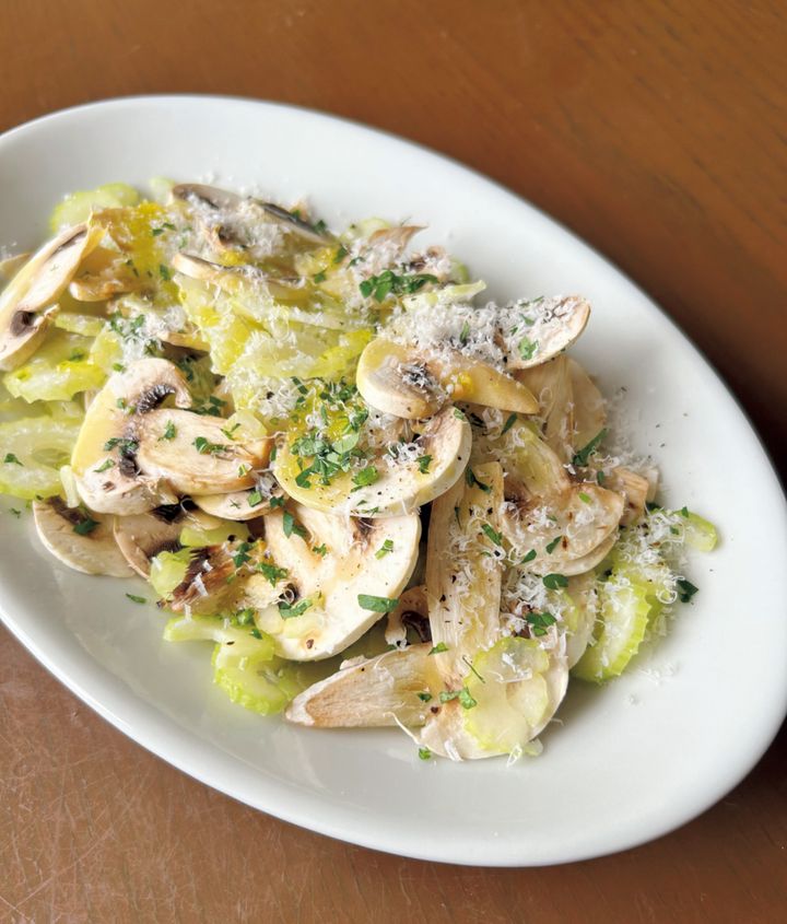 ちょっとしたおもてなしや、テーブルがぐっと洒落るつまみが欲しいときに。フレッシュなマッシュルームにセロリとイタリアンパセリを重ねれば、香りのよいサラダが完成。味わいはもちろん、見た目の美しさもワインを誘います。気負わず作れるのに洗練されている――そんな