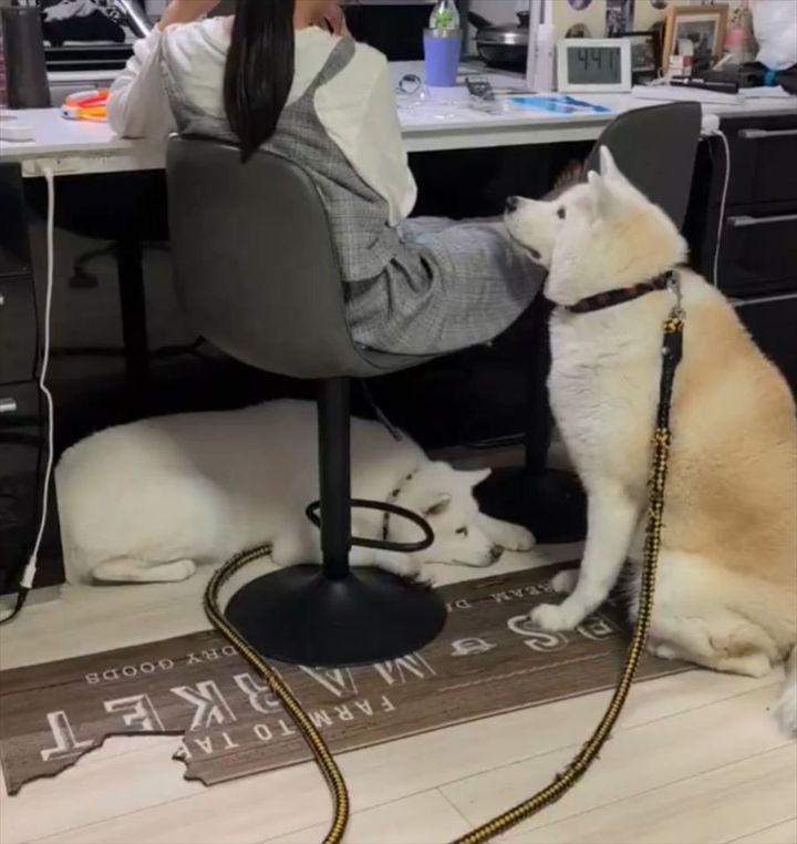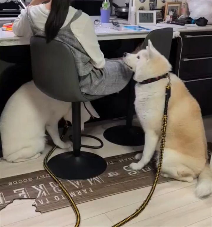 机に座ってオヤツを食べている飼い主さんの横におすわりしているこの子は、秋田犬の『クルミ』ちゃん。 椅子の下にいる子がモゾモゾ動いている一方で、クルミちゃんは微動だにせずじっと視線を送っていたのです。