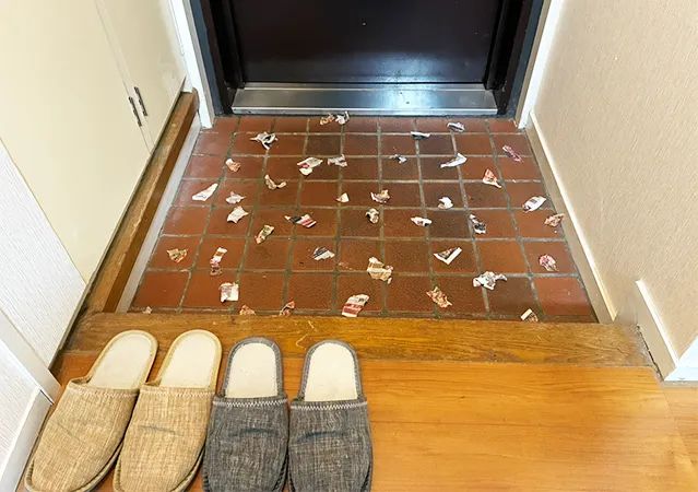次に、チラシを細かくちぎって、玄関にまんべんなく散らします。