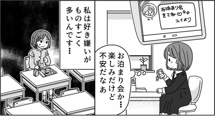 私は自分の部屋でスマホを見ていました。画面には、ユイちゃんからのお泊まり会のお誘いメッセージが。とても楽しみなのですが、私は食べ物の好き嫌いがものすごく多いのです。食べようとしても食べられなくて、自分でも困ってしまうほどです。