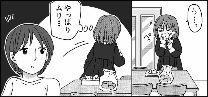 私はママの目を盗んで、苦手なパンを少しだけ食べてみました。けれど、どうしても飲み込むことができませんでした。そんな自分が情けなくて仕方がありません。ママにバレる前に自室へ戻りました。しかしママにはバレていたのか、ママが部屋にやってきました。