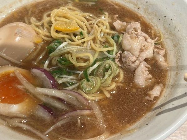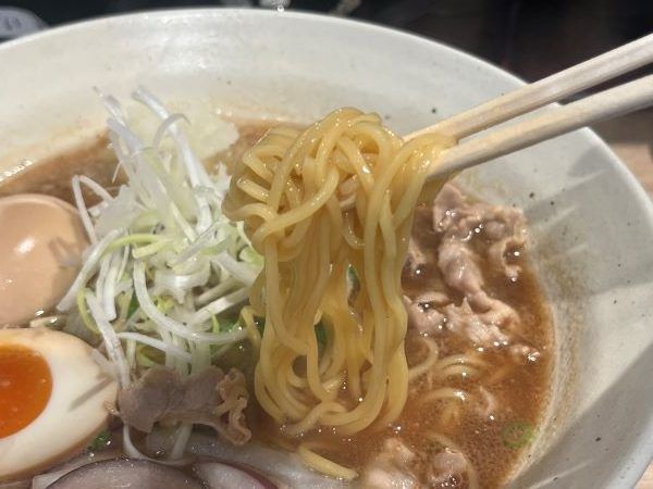 見た感じ濃そうですが、甘みのある醤油ダレで今まで味わったことがないような優しいスープ♪ おいしいーー!! お品書きにある「コクと甘みの醤油かえし」に納得!