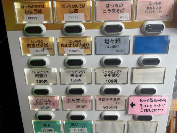 入り口で食券販売機を拝見。安い! おすすめと聞いてた「はっちの肉そばしょうゆ」とトッピング煮玉子を購入♪