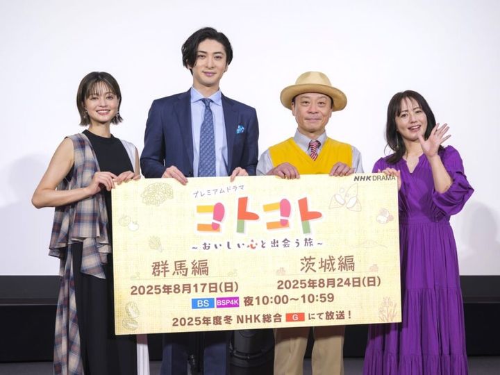 食材の産地を取材し、そこに生きる人々の物語を紡いだNHKのオリジナルドラマ「コトコト~おいしい心と出会う旅~」。生産地の〈いま〉にこだわり、すべて物語の舞台となる地域で撮影されています。会見には主人公・宏人役の古川雄大さん、新たな相棒・根本進役の三宅弘城さん、群馬編のヒロイン・不二谷円役の小林涼子さん、茨城出身で地元農家を演じた磯山さやかさんが登場しました。