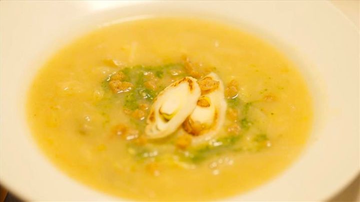 群馬編で宏人が作ったのは、ややとろみのある「白菜と下仁田ねぎのポタージュ」。白菜、下仁田ねぎ、じゃがいもを煮込んだ白いスープに、よく映える深緑色の縮みほうれん草のペースト、食感のアクセントになる生こんにゃくをトッピング。まさに〈群馬の大地の幸〉を凝縮した一杯です。