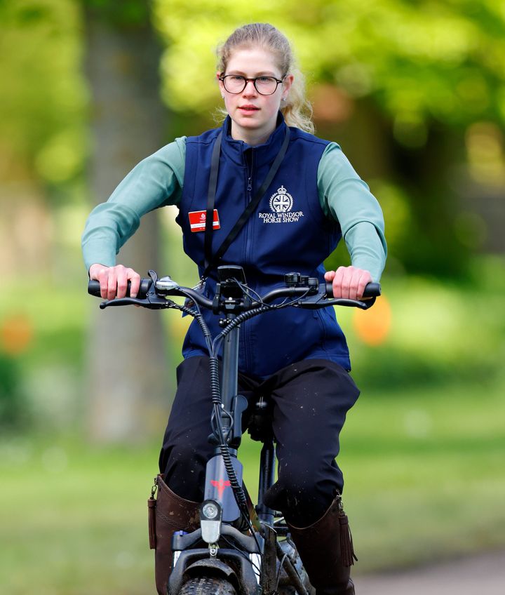 ロイヤル・ウィンザー・ホース・ショーの4日目に、電動アシスト付きマウンテンバイクに乗る、スポーティなルックのレディ・ルイーズ。