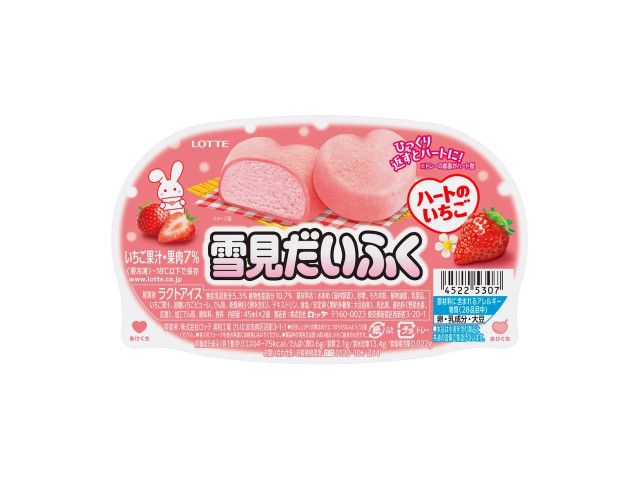 あまずっぱい味わいのいちごアイスをおもちで包んだ、ハートの形の雪見だいふくです。(容器から取り出し、裏返したときにハートの形になっています) おもちの部分もピンク色にした、見た目にもかわいらしい仕立てです。 雪見だいふくは食べた人の心を包み、小さな幸せで心を癒やすだいふくアイスです。