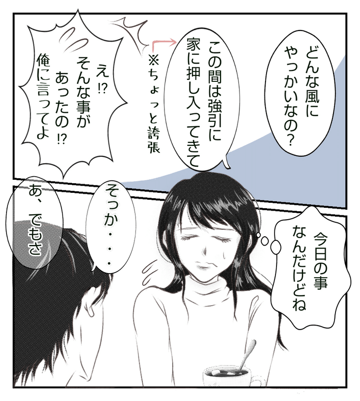 夫のことを根掘り葉掘り聞いて、今日は会えないとわかると、そそくさと帰って行った。