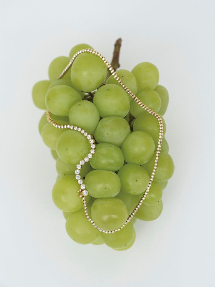 大小のグラデーションで連ねたダイヤモンドがフォルムを変化させ、有機的なラインを描くネックレス。クラシカルなテニスネックレスに、ユーモラスなひねりを添えて。