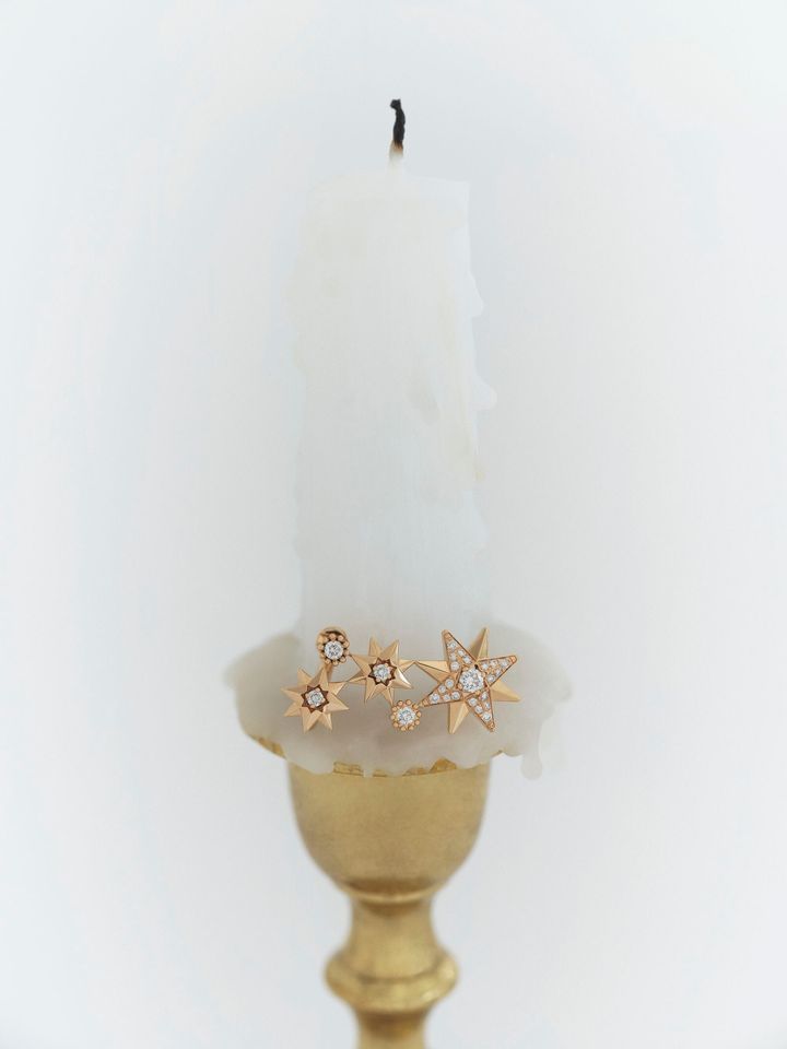 ムッシュ ディオールが愛した幸運の星にインスパイアされた“エトワール デ ヴァン”。大小さまざまなスターモチーフが耳元で瞬き、まるで星々をまとうようにきらめく。