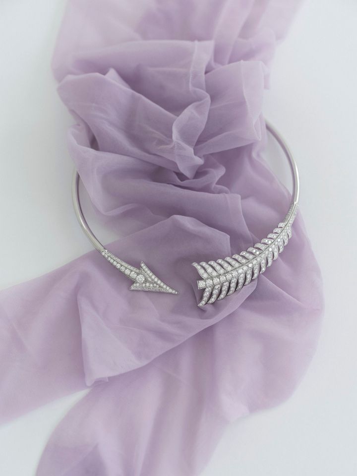 未来へと意志を放つ矢のように。「ブシュロン」の“フレシュ”は、自分の理想をまっすぐに見つめ、前へと進む力をくれるジュエリー。しなやかな弧を描いたネックラインにきらめくダイヤモンドが軌跡を残し、選んだ道を静かに照らす。