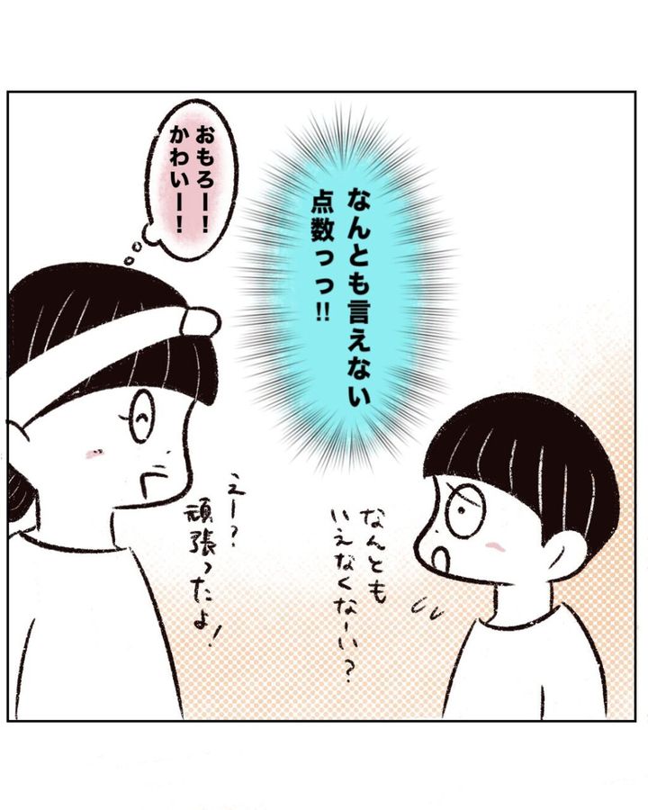 「なんとも言えない点数」という言葉に、心の中で「おもろーかわいー!」と言いながら、困った様子で話すアキくんに「がんばったね」とそっと声をかけるまるさんなのでした。