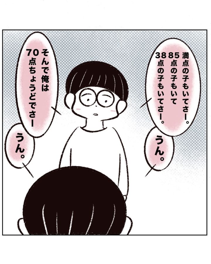 「満点の子もいてさ、85点も38点の子もいて、そんで俺は70点ちょうどでさー」うんうんと頷きながらアキくんの話を聞くまるさん。70点なら平均点くらいじゃんと思っていると・・・。
