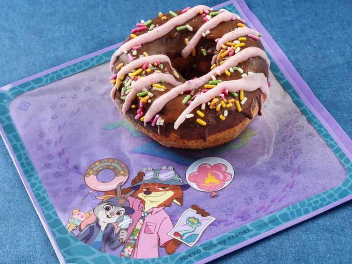 東京ディズニーランドの「スウィートハート・カフェ」、東京ディズニーシーの「マンマ・ビスコッティーズ・ベーカリー」では、『ズートピア』に登場するドーナツをイメージした、カラフルで目を引く「チョコドーナツ」450円が登場します。ドーナツといえば、チーターの警察官・クロウハウザーの大好物! 映画のワンシーンを思い浮かべながら食べてみましょう。
