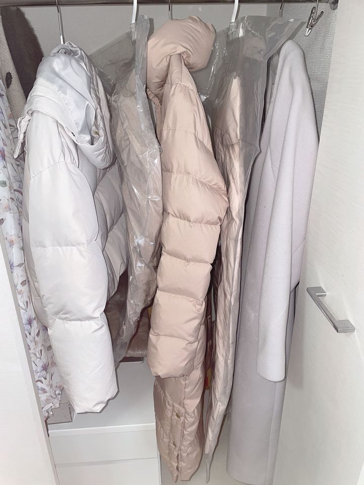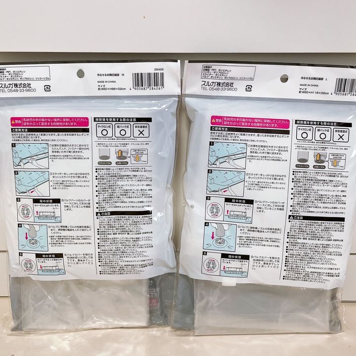 これは本当に画期的!掃除機なしでも手で空気を抜くことができ、フックが付いているのでそのままクローゼットのポールにかけられます。パンパンでギチギチだったクローゼットに、驚くほどの隙間が生まれました。