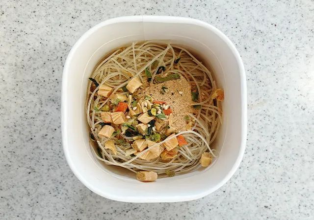 パッケージに記載されている通り、春雨、粉末スープ、かやくを入れましょう。