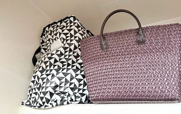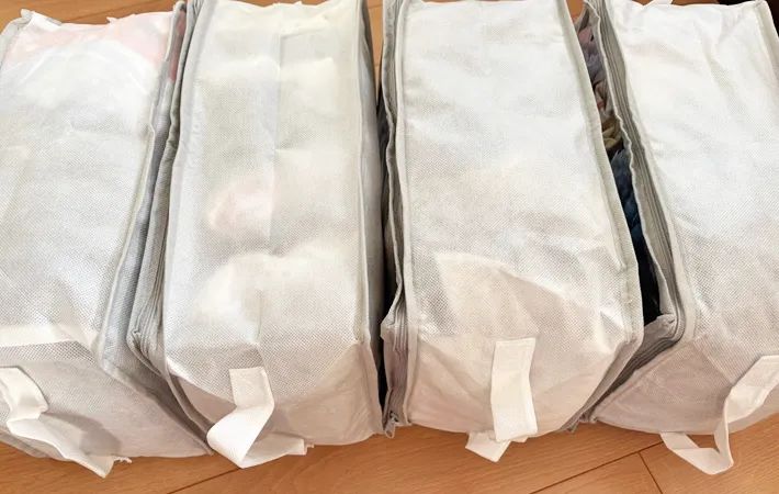 大きな袋とカゴに入れていた子供服が、4つの『収納袋(コミック用)』にすっきり収まりました。