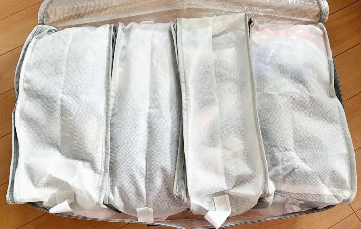 『収納袋(コミック用)』4つ分がすっぽりと収まり、ファスナーもちゃんと閉まりました。