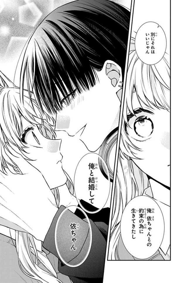 もともとは背も低く、泣き虫だった彌生君。しかし「よりちゃんよりおっきくなって、イジワルされないくらいすごい人」になったら結婚するという昔の約束を胸に努力した結果、高身長イケメン、文武両道、神絵師で料理も上手い完璧男子に。誰もが放っておかないスパダリです。さらに10年近くの間、依を思っていた彌生君はもちろん一途。それどころか家庭環境が複雑な上、自分のビジュアルしか見ていない女子が群がって来ることもあり「この世に自分と依以外不要!」と極論を展開する“愛が重すぎる男子”でもあります。普段の言動は行き過ぎた面白味がありますが、ここぞという時はかっこいい! 「愛が重い男子、いいかも……!」とつい思ってしまいます。
