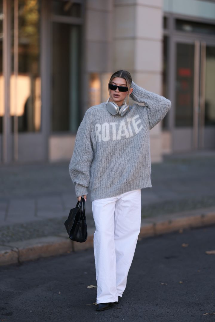 ライトグレー×白の配色で、重たくなりがちなニットコーデも軽やかに。ブラックの絶妙な差し色もスタイリッシュ映えするポイントです。