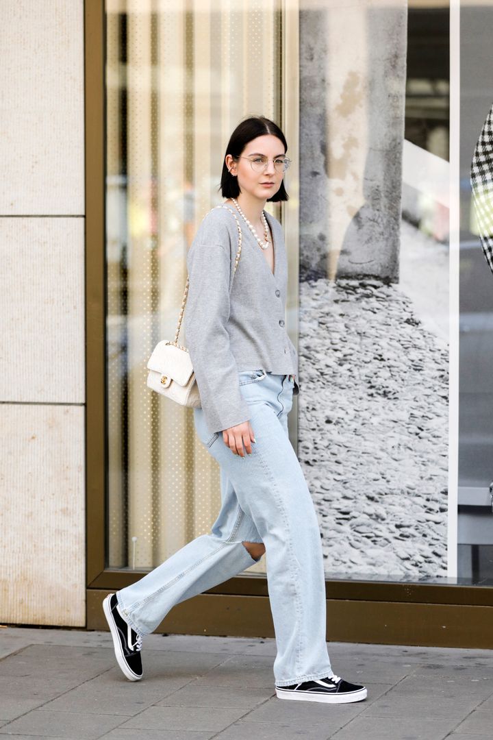インディゴデニムとも非常に相性がよいライトグレーのアイテム。無難にもなりがちな配色なので、モードなアイテム選びを心がけて。