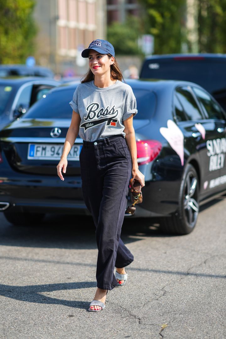 淡いライトグレーはブラックで引き締めると、モード映えするので間違いなし。レザーアイテムやキャップ、サングラスなど、小物でスパイスを効かせるのがコーデ成功の鍵。