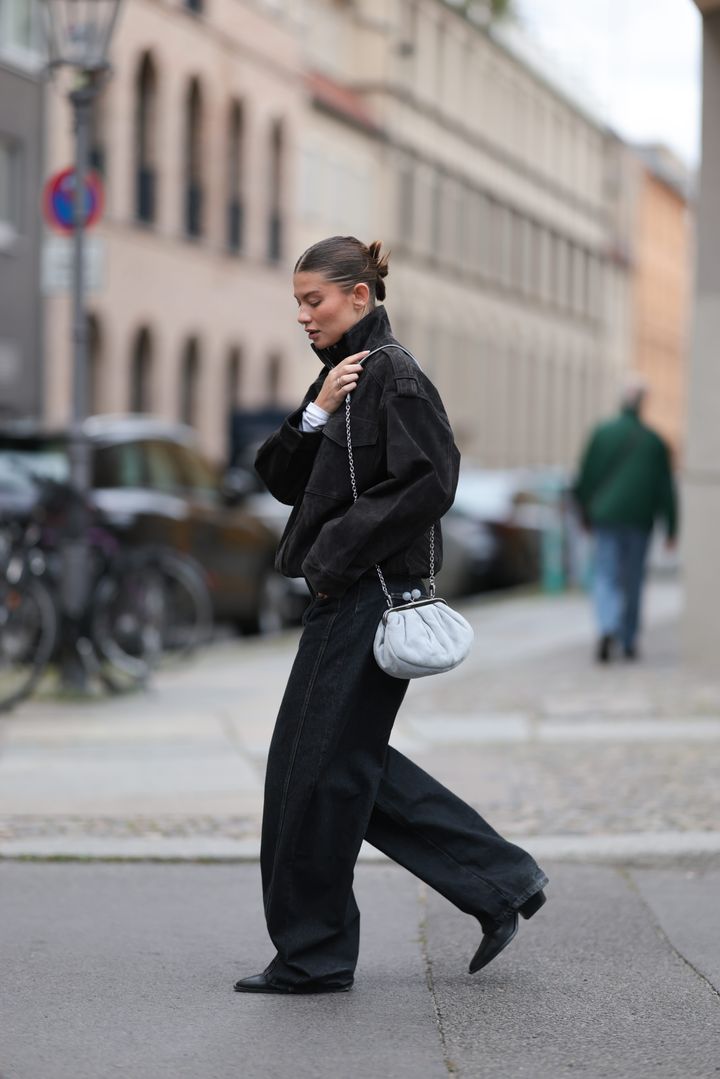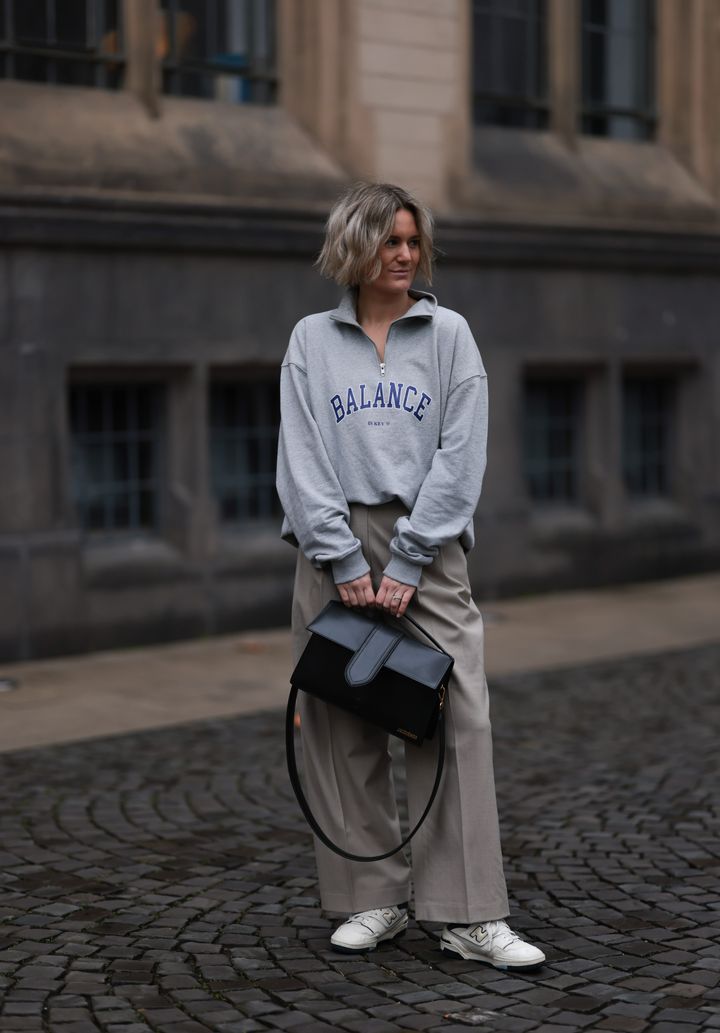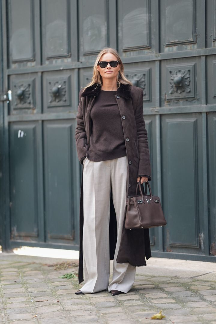 2025年秋冬のトレンドカラーであるチョコレートブラウンとの相性も抜群。ライトグレーのワイドパンツがダークなカラーを上品に受け止めて、シックなムードを後押し。