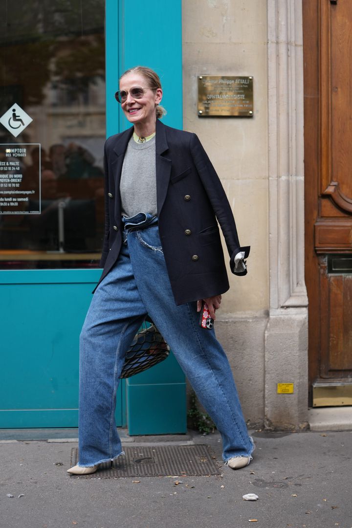 紺ブレザー×グレーニットでオーセンティックに。ワイドデニムでカジュアルダウンして、大人の余裕を醸して。