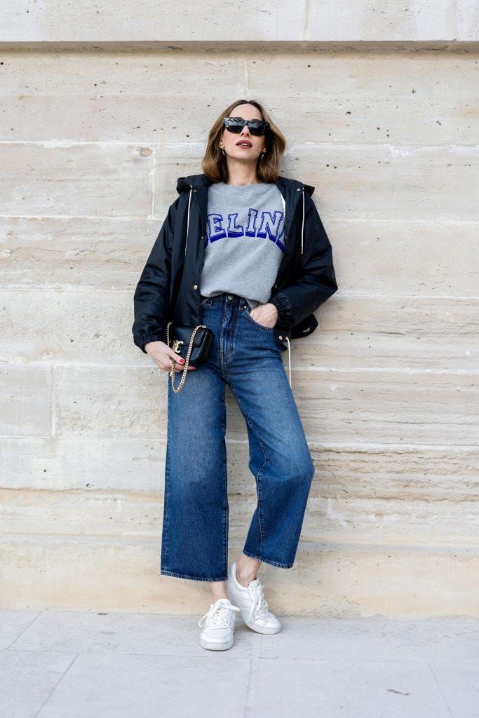 カジュアルの定番ともいえる、グレーのロゴスウェット×デニムの着こなし。ネイビーアウターを羽織ることで、ぐっとエレガントでノーブルな印象にシフトします。