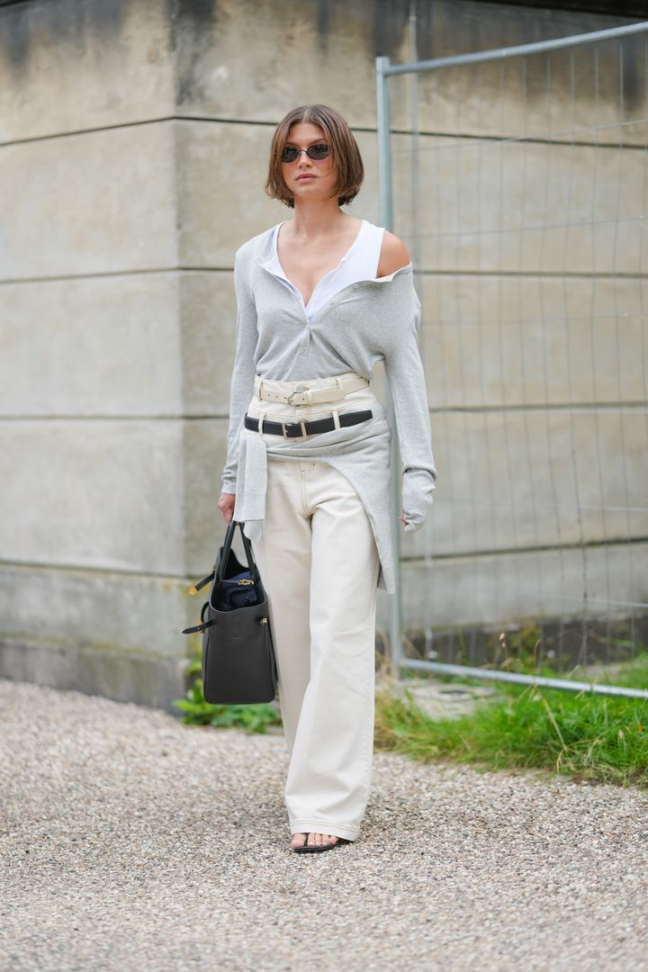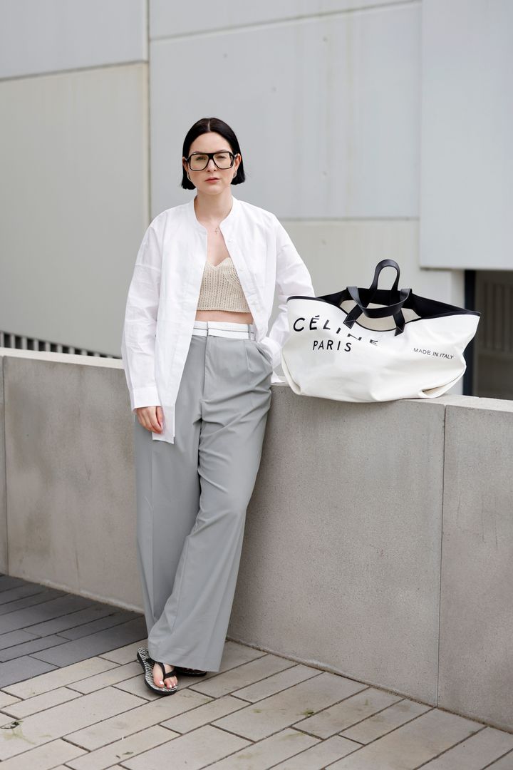 ライトグレーのトップ×白タンクは春夏の王道コンビ。カジュアルになりすぎないよう、ベルトやレザーバッグなど、きちんと感のある小物使いで引き締めるのが正解。